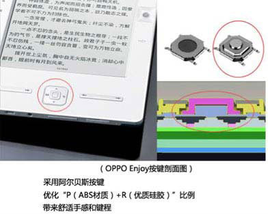 目前按鍵基本采用的都是ABS材質(zhì)類似電腦鍵盤,有過去網(wǎng)吧經(jīng)驗的人就知道,通過看鍵盤上字跡的磨損程度和磨損的鍵位就知道近是流行CS還是勁舞團,字跡的耐磨度是一個不小的考驗。目前一般是采用激光鐳雕或者絲印,但是電子書產(chǎn)品一般是白色的面殼,如果采用激光鐳雕會留下比較明顯的痕跡,但如果直接把絲印暴露在外面,長期摩擦字跡就會消失,為了解決這個矛盾,Enjoy創(chuàng)新采用一種夾層工藝,ABS表面首先噴涂底層(主要是著色),然后絲印,后在絲印上再采用噴油工藝,這樣就保證了絲印的耐磨度同時也隔絕了手上汗?jié)n對絲印的侵蝕。