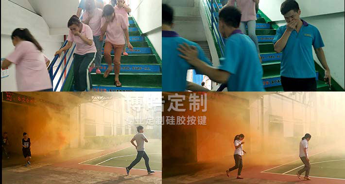 消防演習(xí)現(xiàn)場(chǎng)模擬演示一場(chǎng)突如其來(lái)的大火,拉起煙霧彈,一時(shí)煙霧四起并迅速蔓延,拉起警報(bào)后,正在生產(chǎn)汽車硅膠按鍵的家人緊急“逃生”,從東西兩個(gè)消防通道迅速、有序撤離。逃生時(shí),員工們彎腰、低頭、用毛巾或衣服捂住口鼻迅速撤離到操場(chǎng)安全區(qū)域,各部門集合整隊(duì)清點(diǎn)人數(shù),整個(gè)疏散過(guò)程緊張、有序。