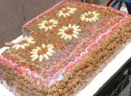 切糕包括核桃、花生、葵花籽、葡萄干、杏干,其實(shí)就成本上來說也不算便宜,但也不算多貴。主要靠糖粘合;趁熱將它倒進(jìn)一個很結(jié)實(shí)的木槽之中(木槽由幾塊單獨(dú)的厚木板圍成,用粗麻繩和兩頭彎的大鐵釘固定在一起),再用一塊厚木板蓋在切糕上面,木板上面再壓上一些重物,比如石塊或鐵塊,總之要夠重夠分量,大概要4、5個小編的重量才行。就這樣切糕慢慢得被壓到很緊實(shí),里面很多水分也隨著木槽底部的縫隙慢慢流出。兩天之后,移開重物或者小胖們,再撬起鐵釘,解開麻繩,取下木板,一塊結(jié)結(jié)實(shí)實(shí),香氣四溢的切糕就呈現(xiàn)在我們眼前了。