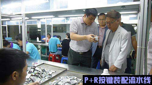 在生產(chǎn)現(xiàn)場(chǎng),吳總為cisco領(lǐng)導(dǎo)講解P+R按鍵的裝配知識(shí)以及工藝生產(chǎn)難點(diǎn)。