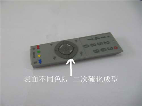 這款產(chǎn)品的生產(chǎn)難點在于表面有一種不同顏色導航鍵,這個是通過另外一套色K模具進行二次硫化成型制成。